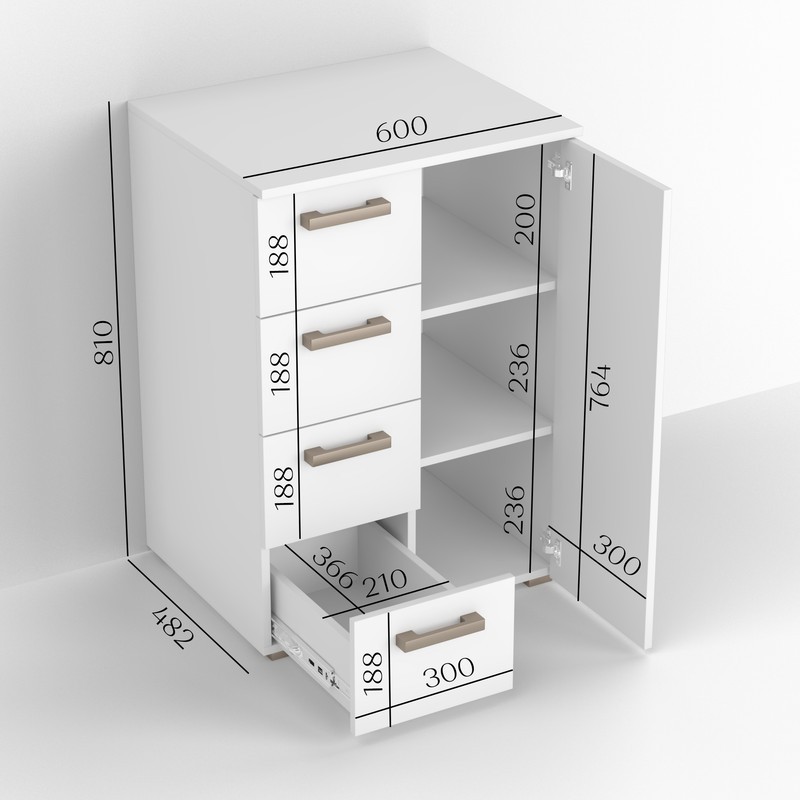 Продуманная конструкция 4 вместительных ящика -для удобного хранения одежды,текстиля та аксессуаров.Отдельная секция с дверцей-идеальное место для более габаритных вещей.Современный дизайн Лаконичные формы та универсальные цвета гармонично дополнят любой интерьер.Надежные материалы Высокое качество изготовление обиспечивает прочность,долговечность и легкость в уходе.Эргономичность Оптимальные размеры позволяют разместить комод в спальне,гостинной,прихожой или детской комнате.Комод ТКБ-363-удобство и стиль в каждой детали!